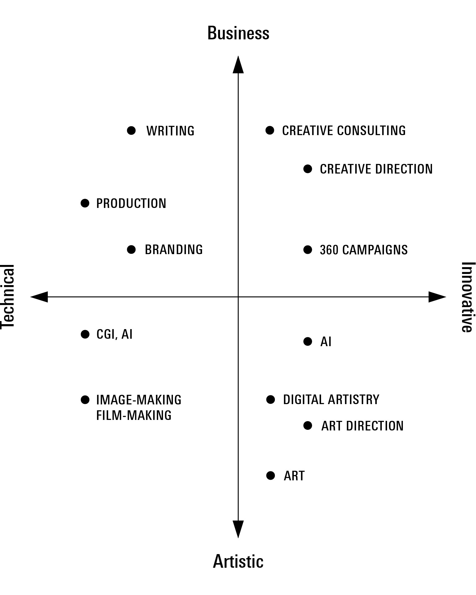 Creative Direction Campaign Development Film Making Image Making Computer Generated Imagery Artificial Intelligence Production Storytelling, Writing Consulting, Strategy Physical Direction